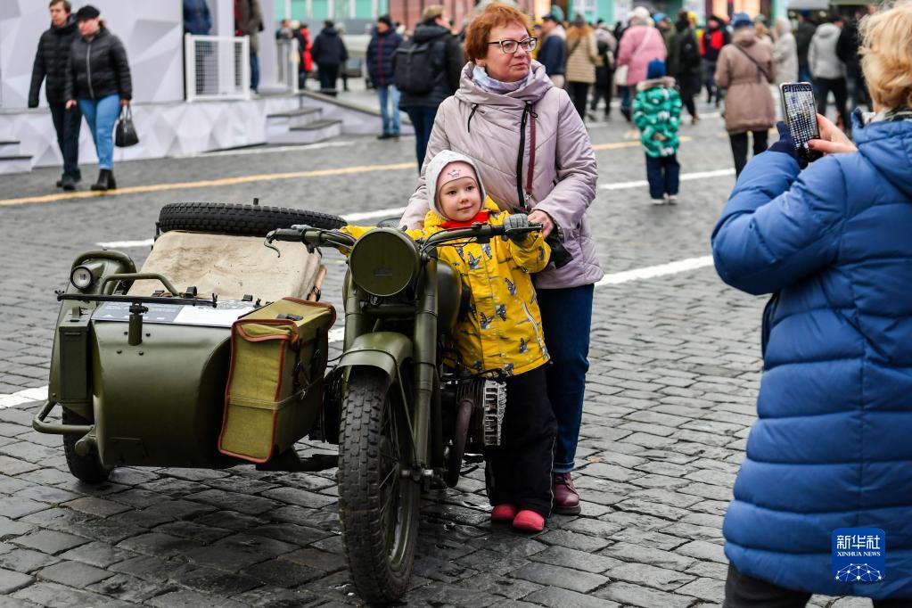 11月7日,在俄罗斯首都莫斯科,人们在以纪念1941年苏联红场阅兵式为主题的露天展览上拍照。