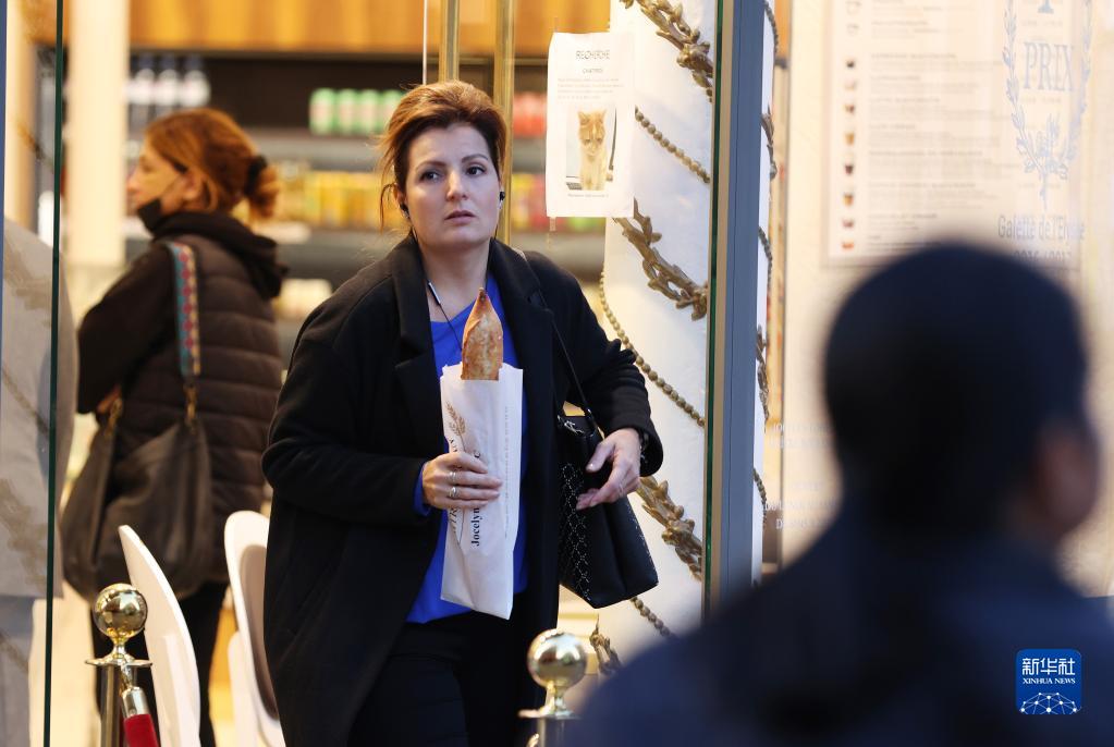 11月7日,一名女子拿着刚刚买到的法棍面包走出法国巴黎一家面包店。