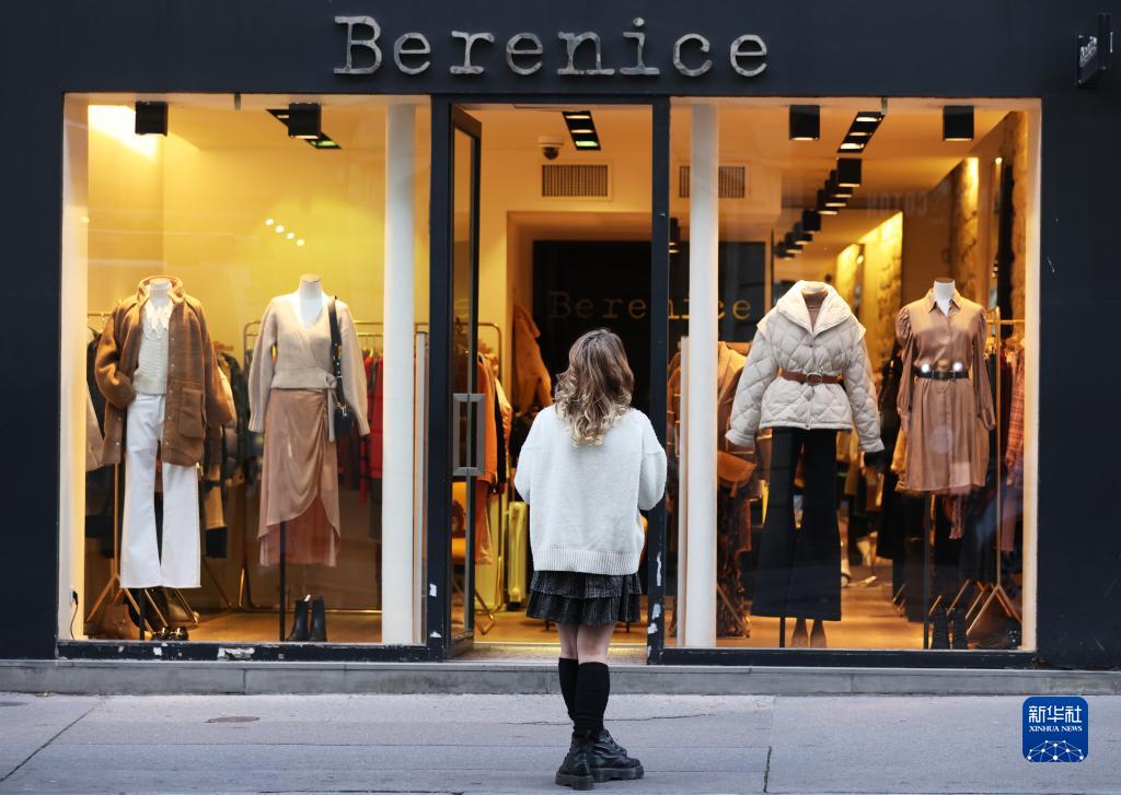 11月7日,一名女子望着法国巴黎一家服装店橱窗里的新品服装。