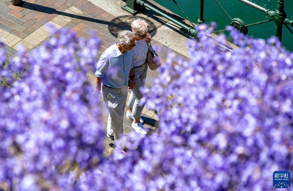 11月7日,在澳大利亚悉尼,人们从蓝花楹树下走过。