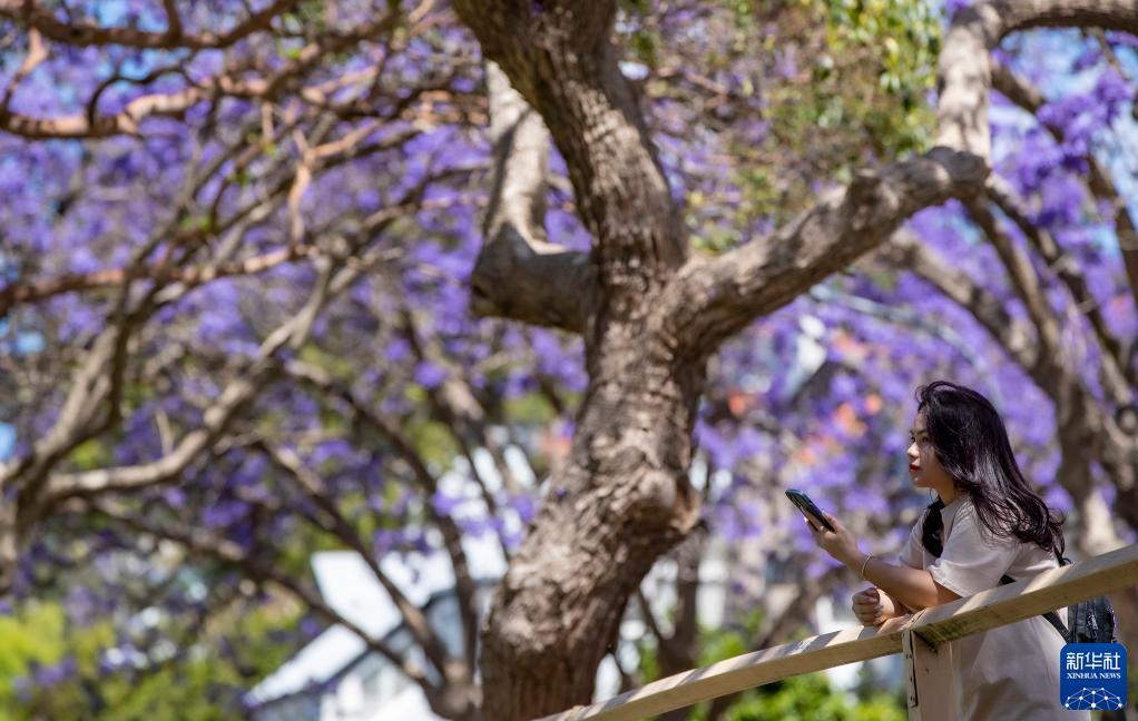 11月8日,在澳大利亚悉尼,一名女子在蓝花楹树下休息。