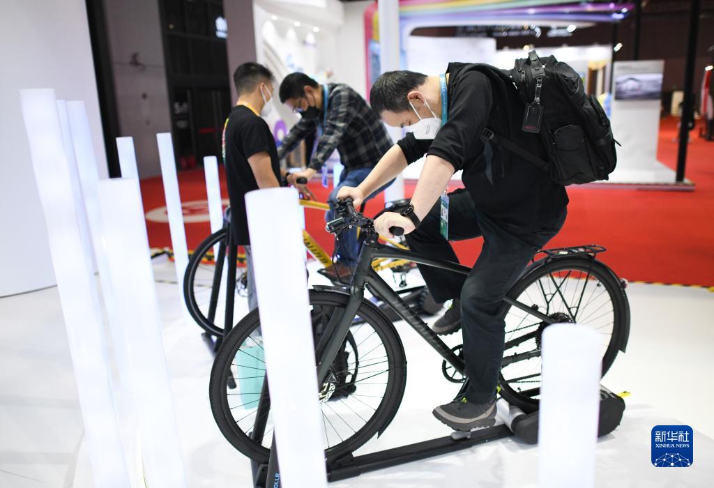 11月8日,观众在第五届进博会上体验展出的自行车。