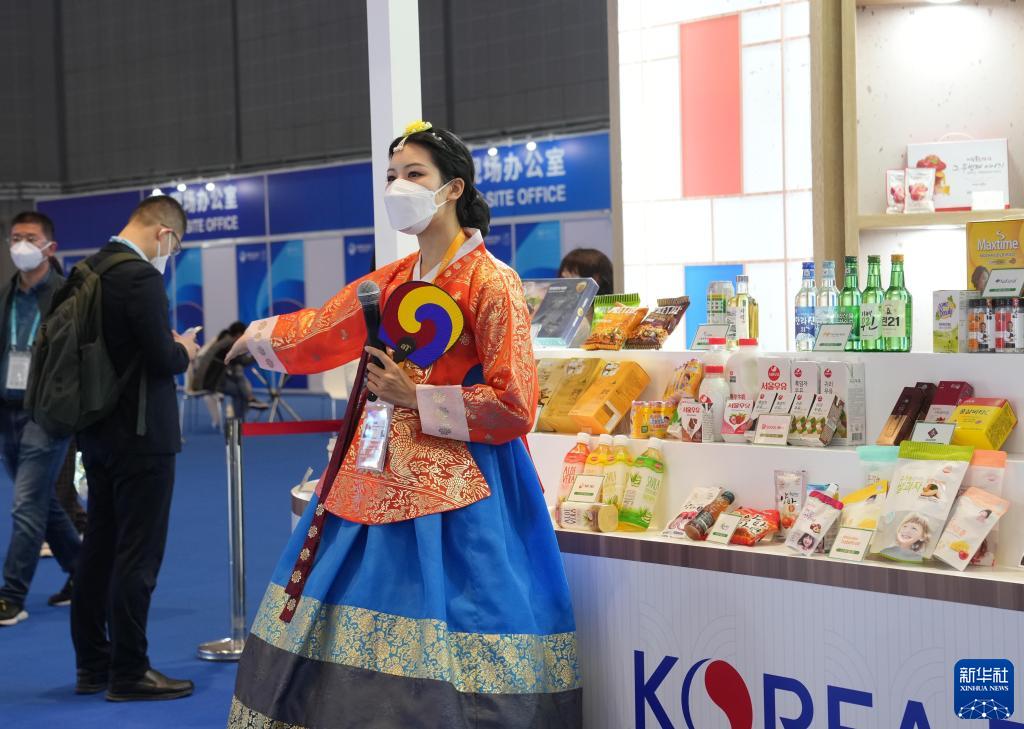 11月7日,第五届进博会韩国食品展台工作人员在现场接待观众。