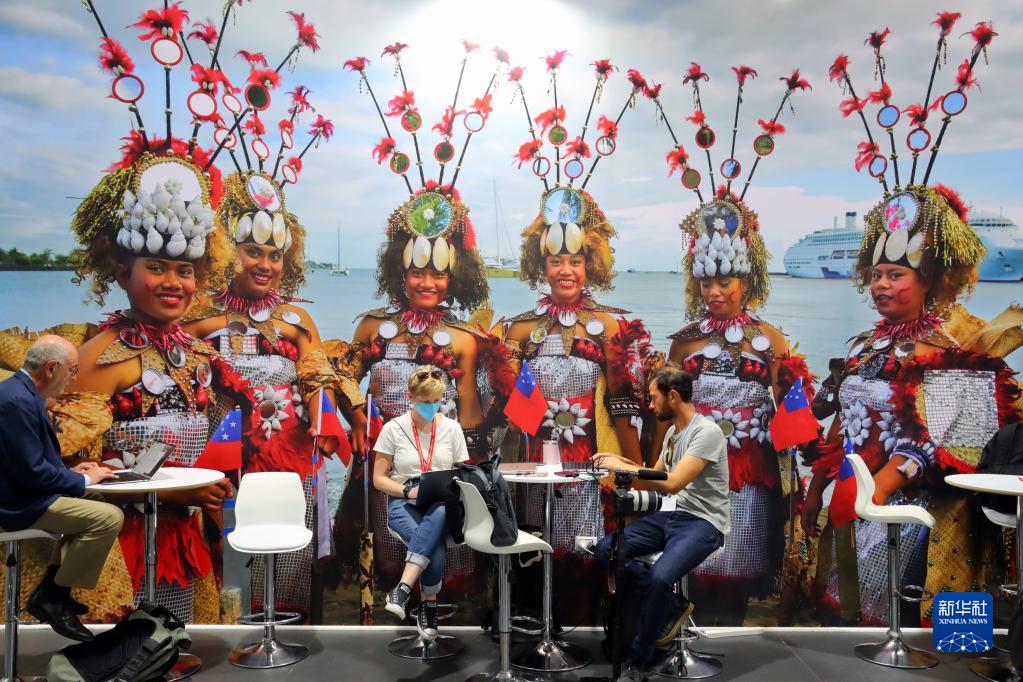 11月10日,在埃及沙姆沙伊赫,参会者坐在联合国气候变化大会展区内一块宣传板旁。