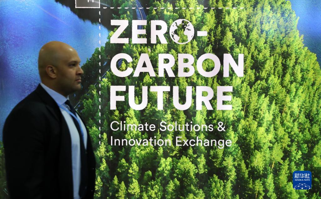 11月10日,在埃及沙姆沙伊赫的联合国气候变化大会展区内,参会者走过一块写有“零碳未来”的宣传板。
