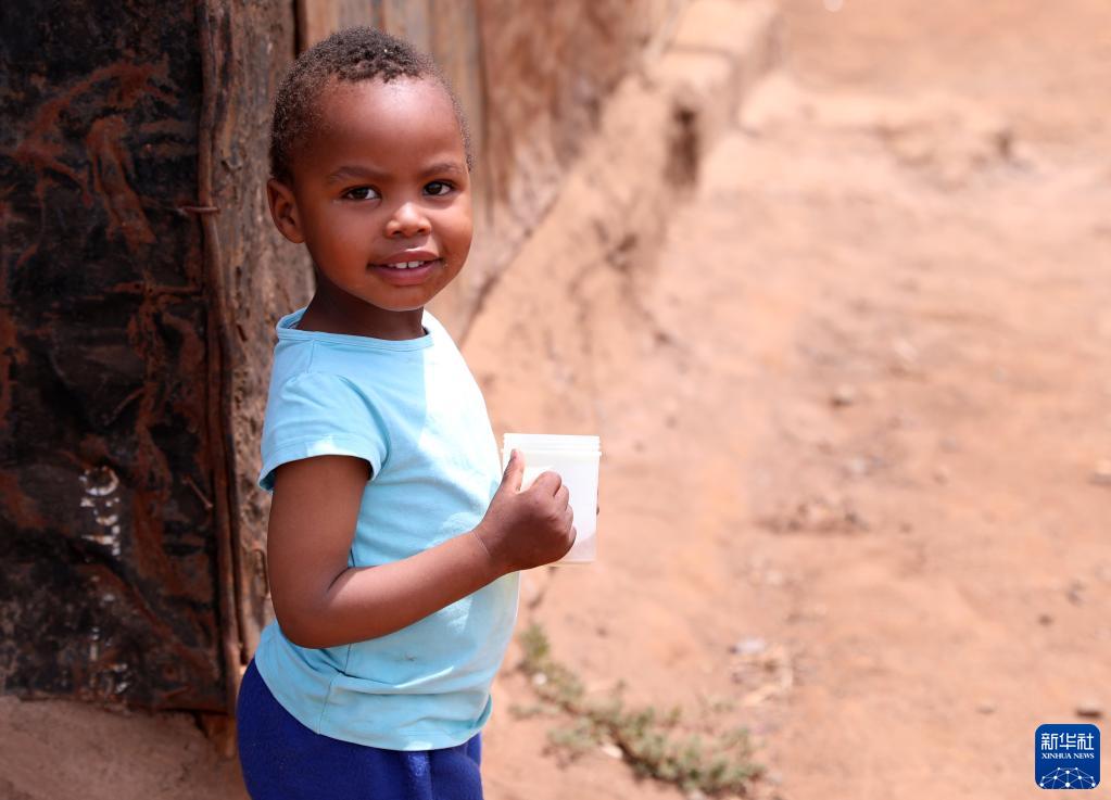 11月10日,一个孩子手握水杯站在肯尼亚基姆卡的一座幼儿园内。
