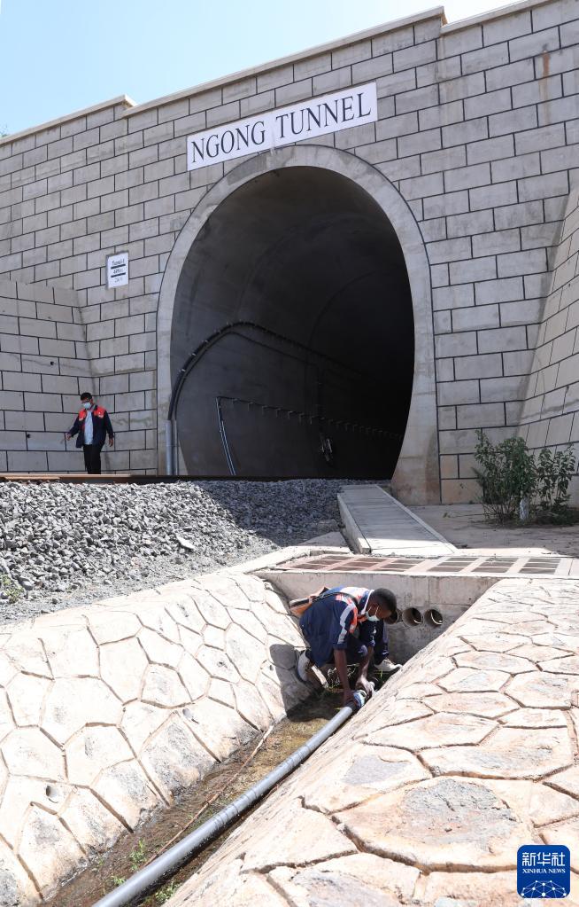 11月10日,一名工作人员在肯尼亚内马铁路恩贡隧道入口处维护水管。
