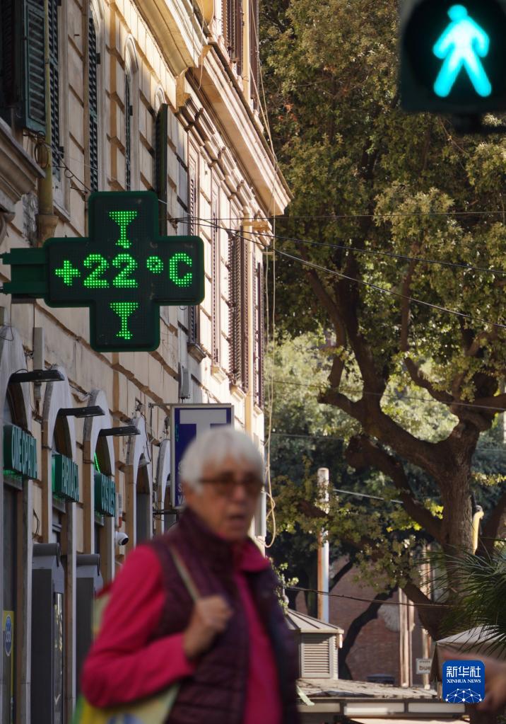11月11日,意大利罗马一处药店的温度计显示实时温度为22摄氏度。