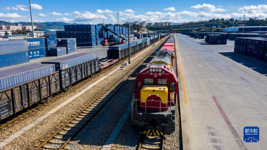 满载30个标准集装箱的中老铁路新年首趟国际货物列车停靠在中铁联集昆明中心站(2022年1月1日摄,无人机照片)。新华社记者 胡超 摄