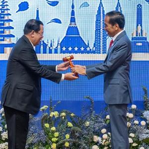 11月13日,在柬埔寨首都金边,柬埔寨首相洪森(左)将东盟轮值主席木槌移交给2023年东盟轮值主席国印度尼西亚总统佐科。