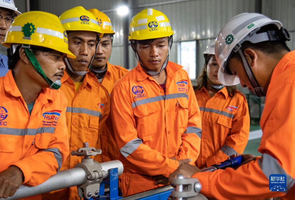 11月13日,在印度尼西亚万隆,印尼员工在中国中铁电气化局雅万高铁资源管理中心学习中国标准“简统化”接触网零部件装配工艺。