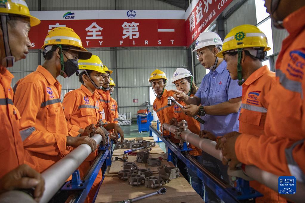 11月13日,在印度尼西亚万隆,印尼员工在中国中铁电气化局雅万高铁资源管理中心学习中国标准“简统化”接触网零部件装配工艺。