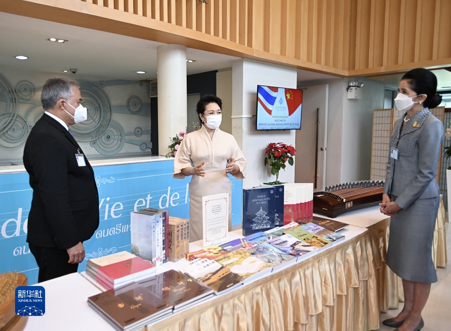 当地时间11月19日上午,国家主席习近平夫人彭丽媛在泰国总理夫人娜拉蓬陪同下参观甘拉雅尼音乐学院。这是彭丽媛向甘拉雅尼音乐学院赠送中国古筝和中国文化音乐类书籍及音像制品。