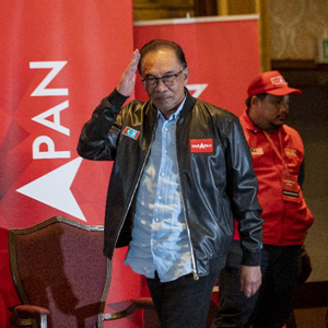 11月20日,在马来西亚雪兰莪州的梳邦再也,希望联盟领袖安瓦尔(前)出席新闻发布会。