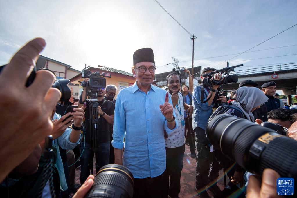 11月19日,在马来西亚槟榔屿州一处投票站,希望联盟领袖安瓦尔在投票后展示手指。