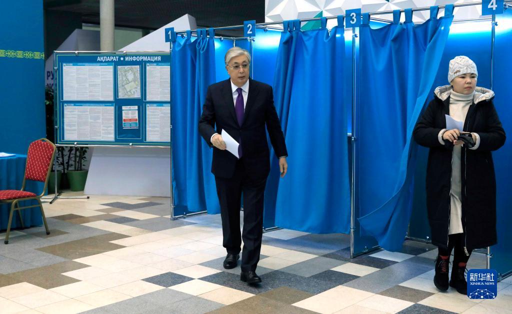 11月20日,哈萨克斯坦总统托卡耶夫(左)在阿斯塔纳一处投票站投票。
