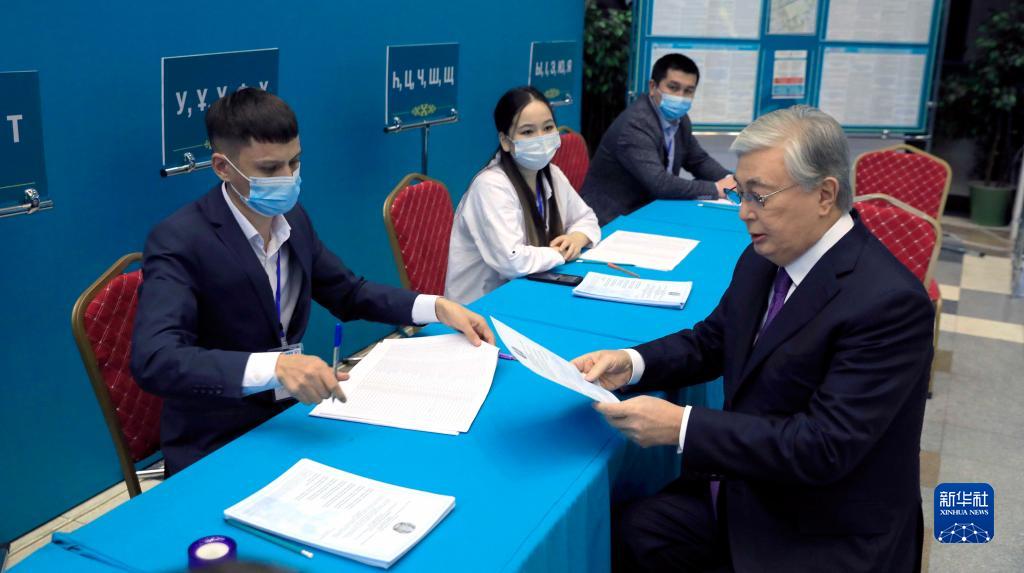 11月20日,哈萨克斯坦总统托卡耶夫在阿斯塔纳一处投票站登记投票。