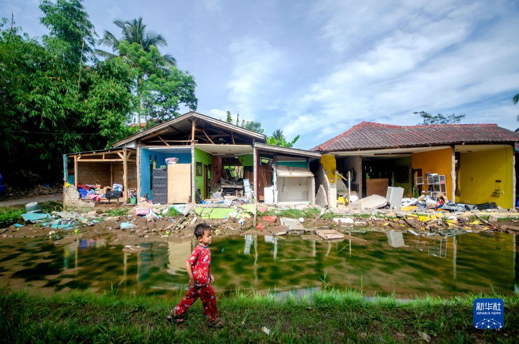 11月23日,在印度尼西亚西爪哇省展玉地区的地震灾区,一名儿童从受损房屋旁走过。