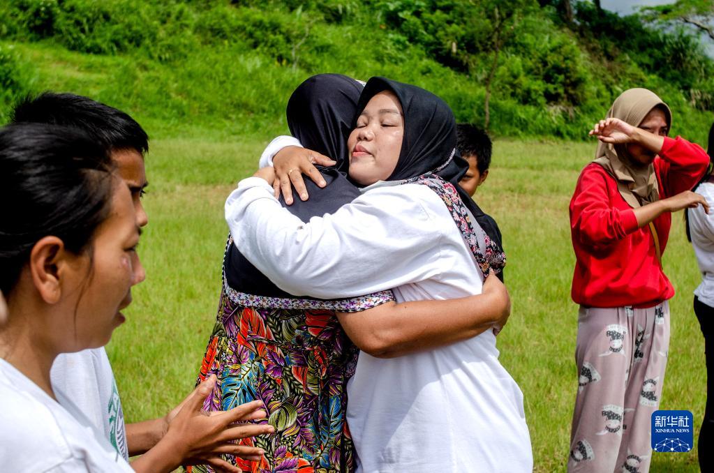 11月23日,在印度尼西亚西爪哇省展玉地区的地震灾区,人们相互拥抱安慰。