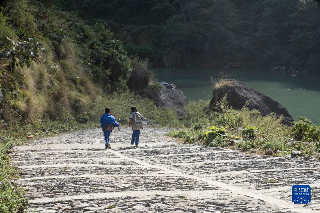 11月8日,尼泊尔勒姆宗县村民走在水电站项目公司帮助修缮的道路上。