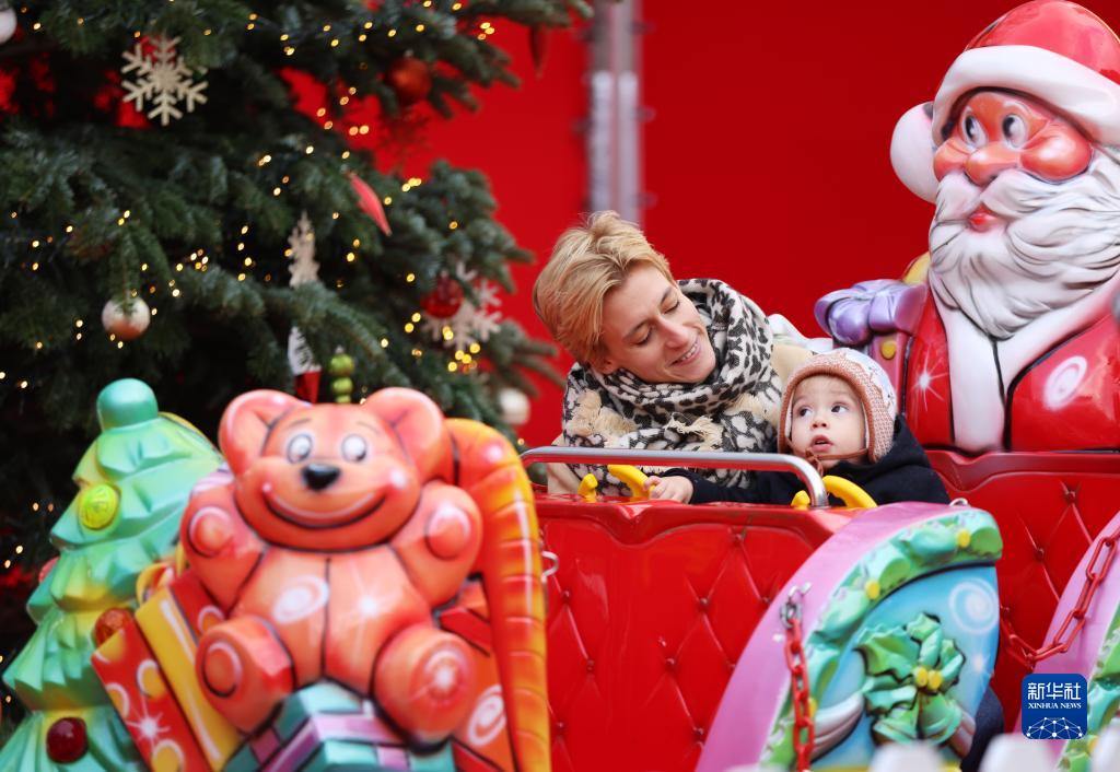 11月24日,一对母子在法国巴黎杜伊勒里花园的圣诞市场休闲。