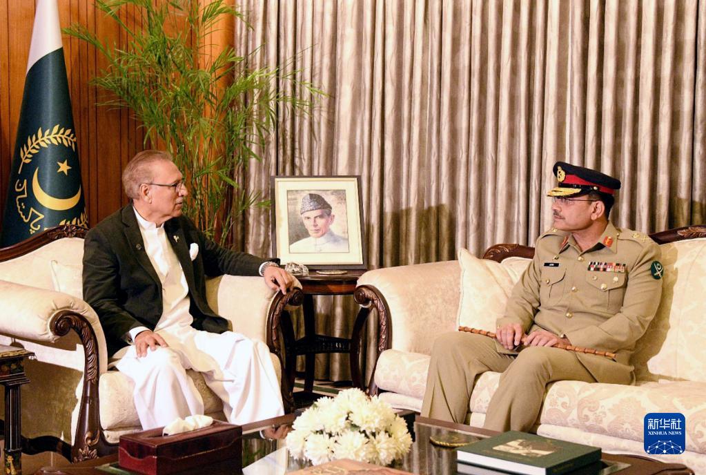 11月24日,巴基斯坦总统阿尔维(左)在首都伊斯兰堡会见候任陆军参谋长赛义德·阿西姆·穆尼尔。