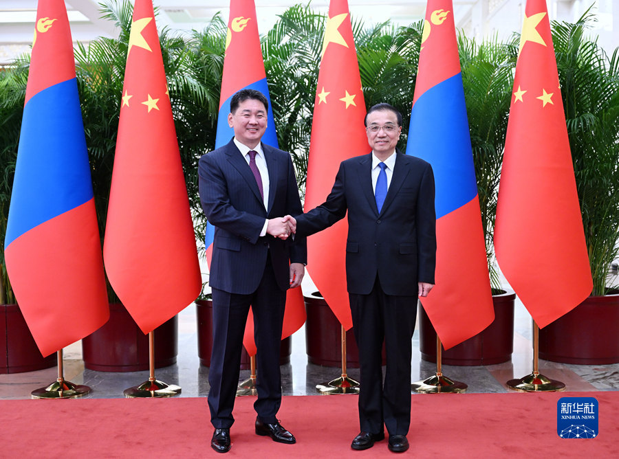 李克强表示,中蒙是山水相连的友好邻邦,发展友好合作条件得天独厚,在多个方面互补优势明显。习近平主席将同总统先生举行会谈,全面规划两国关系发展。中方始终高度重视对蒙关系,将中蒙关系放在周边外交的重要位置,愿同蒙方密切高层交往,尊重彼此核心利益和重大关切,加强发展战略对接,深化各领域互利合作,增进在地区和国际事务中的沟通协调,携手推动中蒙关系不断取得新发展。