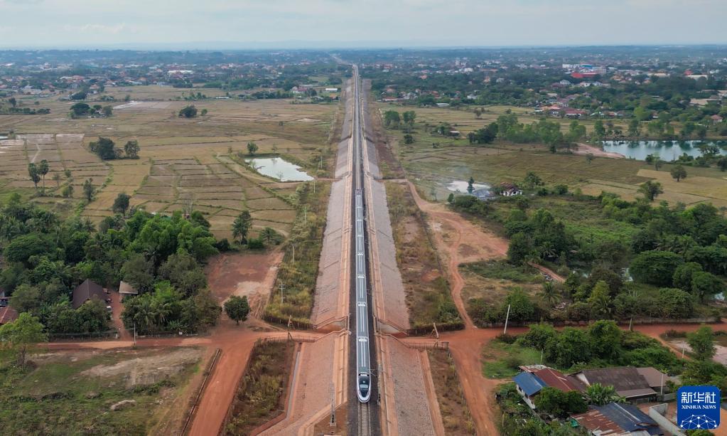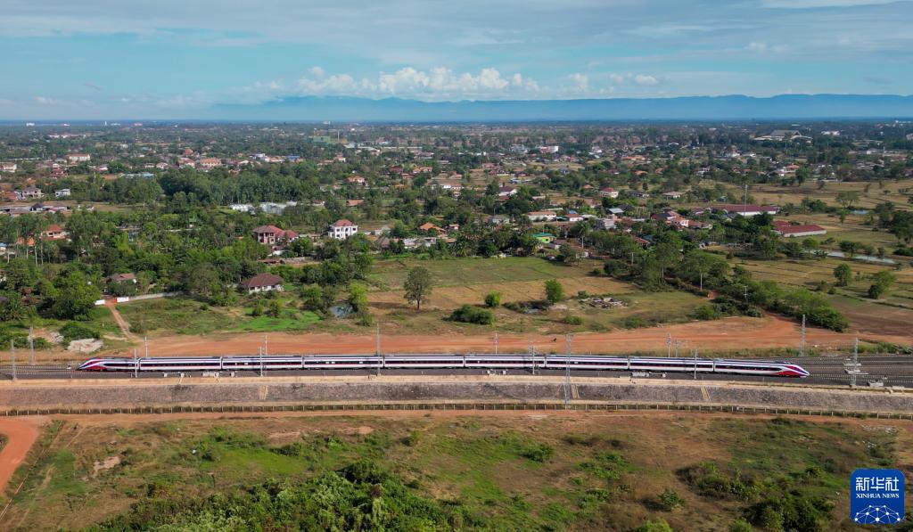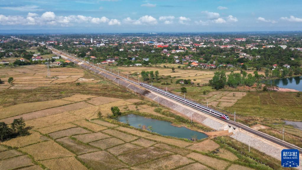 这张11月25日的航拍照片显示,“澜沧号”动车组行驶在老挝万象郊外的中老铁路老挝段上。新华社发(凯乔摄)