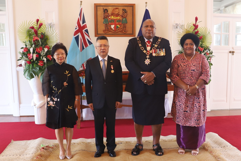 斐济总统府、外交部官员、大使夫人卢琦及中国使馆外交官等应邀出席了授勋仪式。