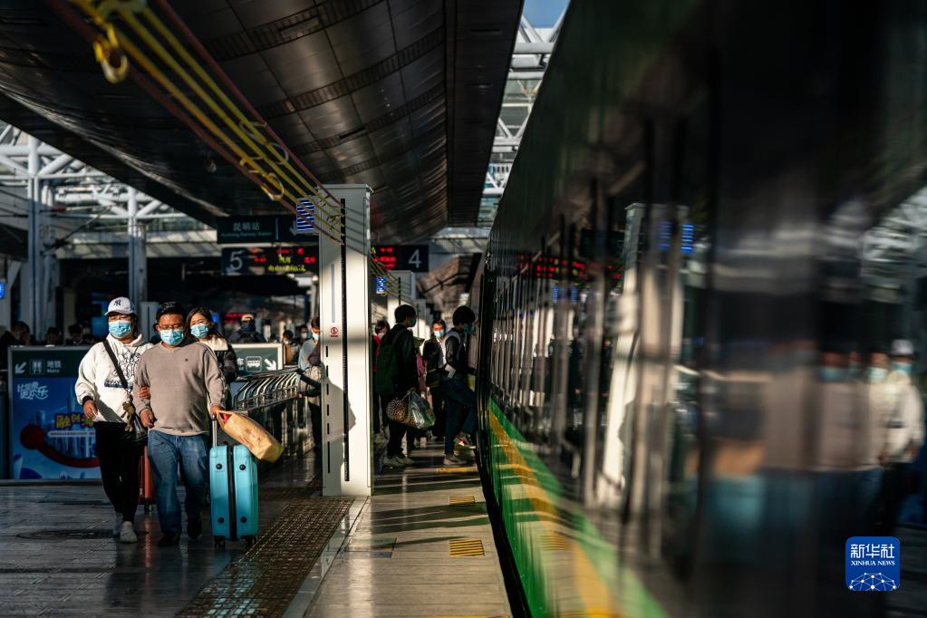 11月23日,旅客在昆明站进站乘坐中老铁路列车。