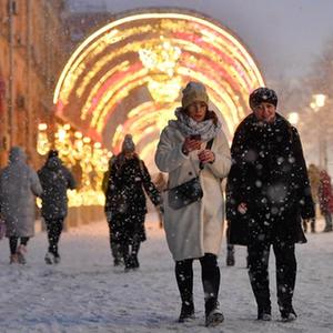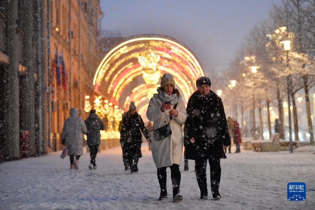 12月10日,在俄罗斯莫斯科,人们在雪中行走。