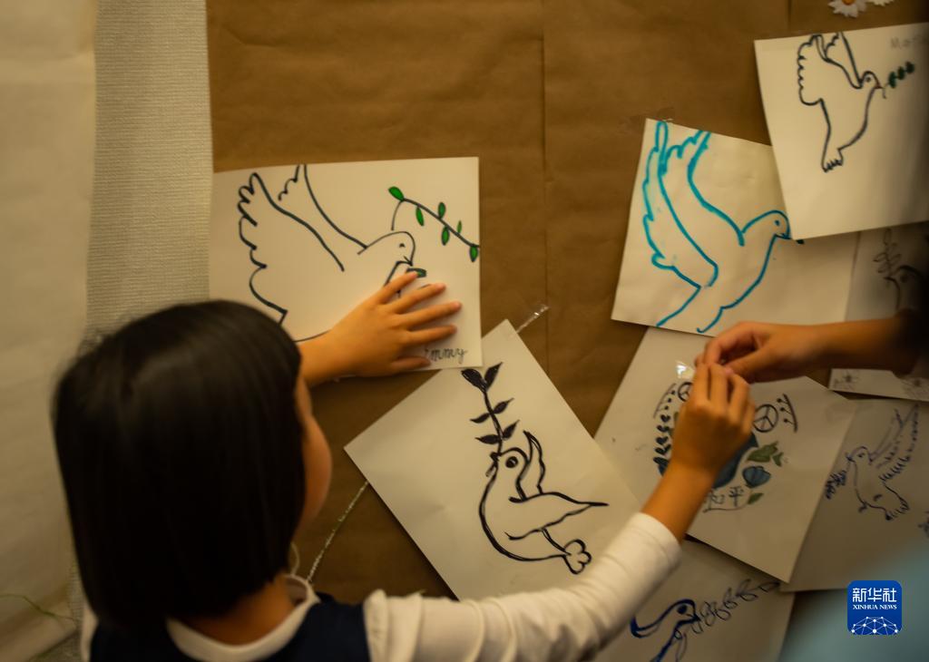 12月11日,一名女孩在美国旧金山参加“南京祭”活动时张贴以和平鸽为主题的绘画。
