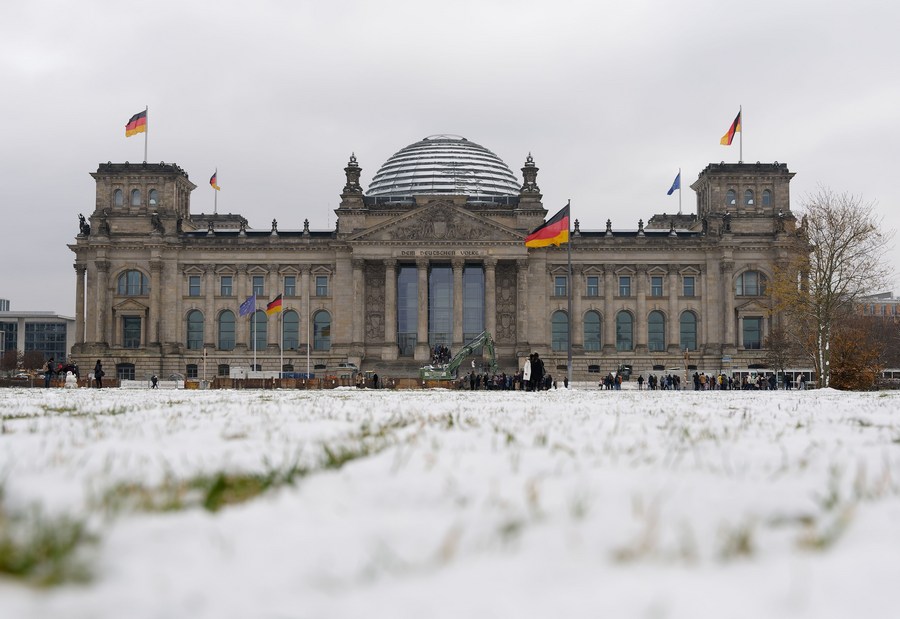 11月20日,在德国柏林,德国国会大厦前的草坪被积雪覆盖。新华社发(斯特凡·蔡茨摄)