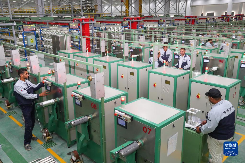 12月15日,在位于埃及苏伊士省的中国巨石埃及玻璃纤维股份有限公司(巨石埃及公司),工人在玻璃纤维生产线上工作。