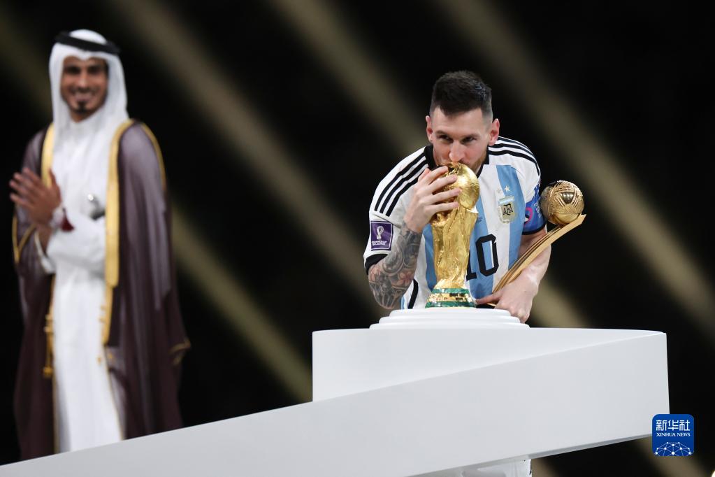 12月18日,获得世界杯金球奖的阿根廷队球员梅西(右)在颁奖仪式上亲吻大力神杯。