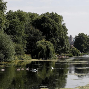 7月20日,水禽在英国伦敦圣詹姆斯公园的湖面上游弋。新华社记者韩岩摄