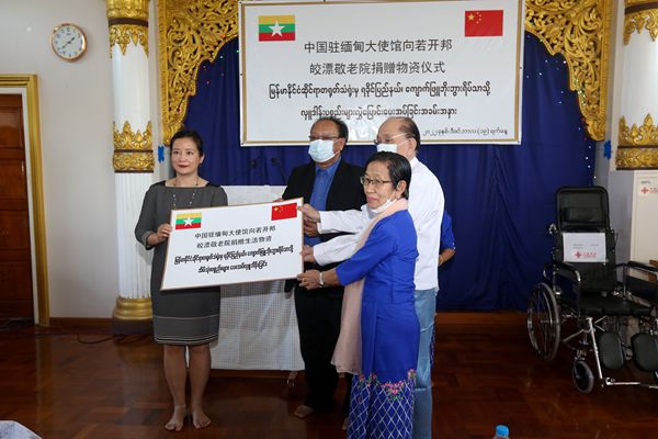 12月19日,在缅甸若开邦皎漂镇,中国驻缅甸大使馆向若开邦皎漂敬老院捐赠物资。苗觉梭摄