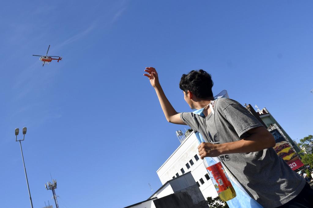 12月20日,球迷向阿根廷队成员乘坐的直升机挥手致意。新华社/美洲通讯社