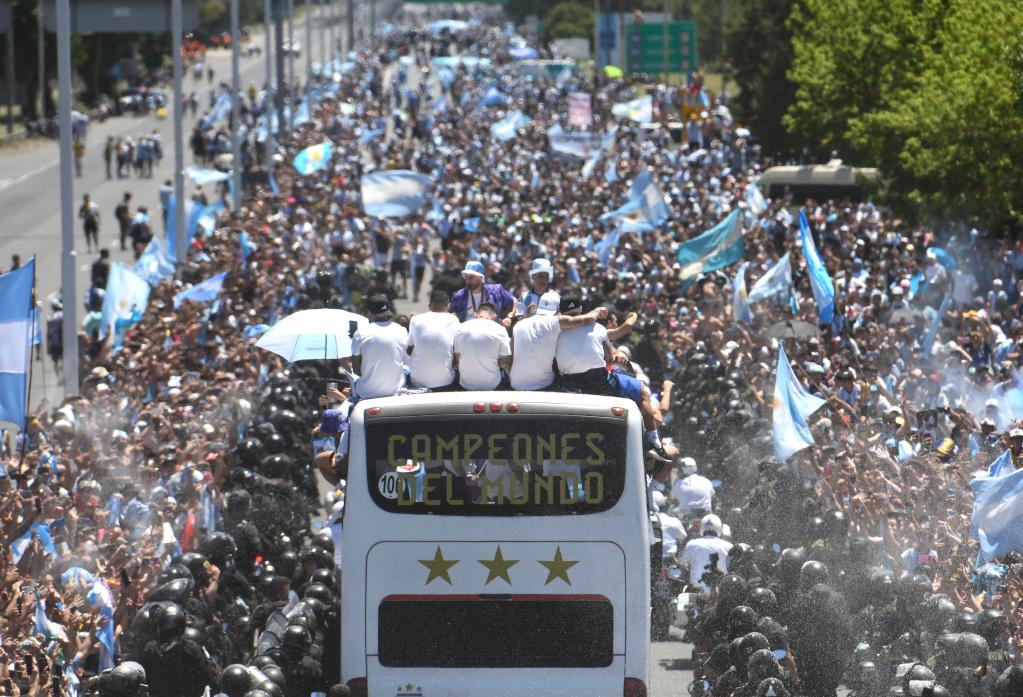 11时许,巡游车队从距离市中心约37公里的国家队驻地出发。一路上数以万计的阿根廷球迷夹道欢迎,他们载歌载舞,挥舞着手中的阿根廷国旗。车队所到之处,欢呼声此起彼伏,未有停歇。