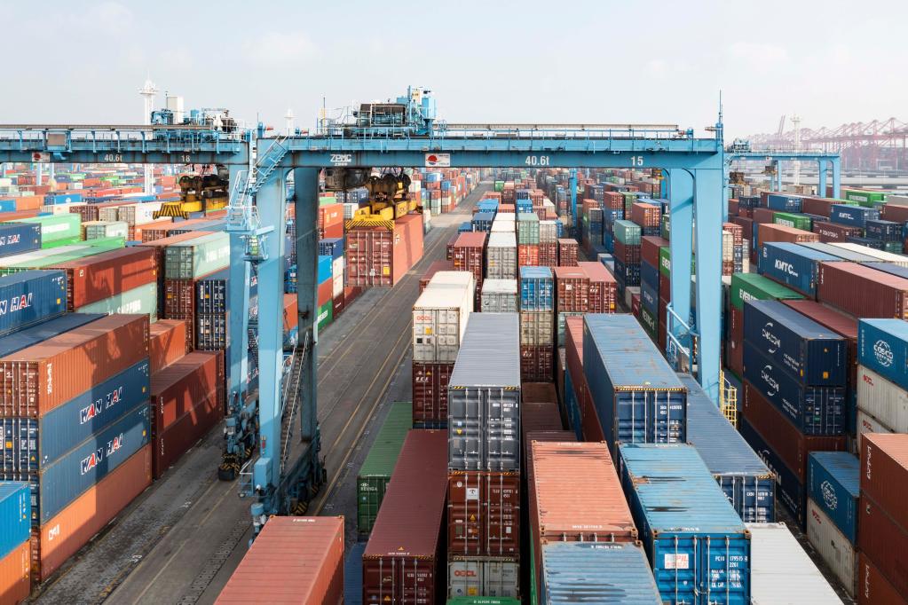宁波舟山港梅山港区堆场,龙门吊在繁忙吊运集装箱(无人机照片)。(新华社发,蒋晓东摄)