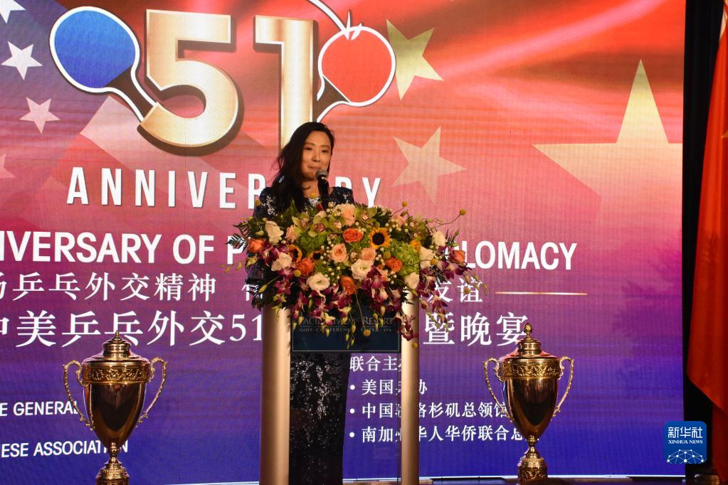12月20日,美国乒乓球协会首席执行官沈伟妮在洛杉矶举行的纪念中美“乒乓外交”51周年论坛暨晚宴上致辞。
