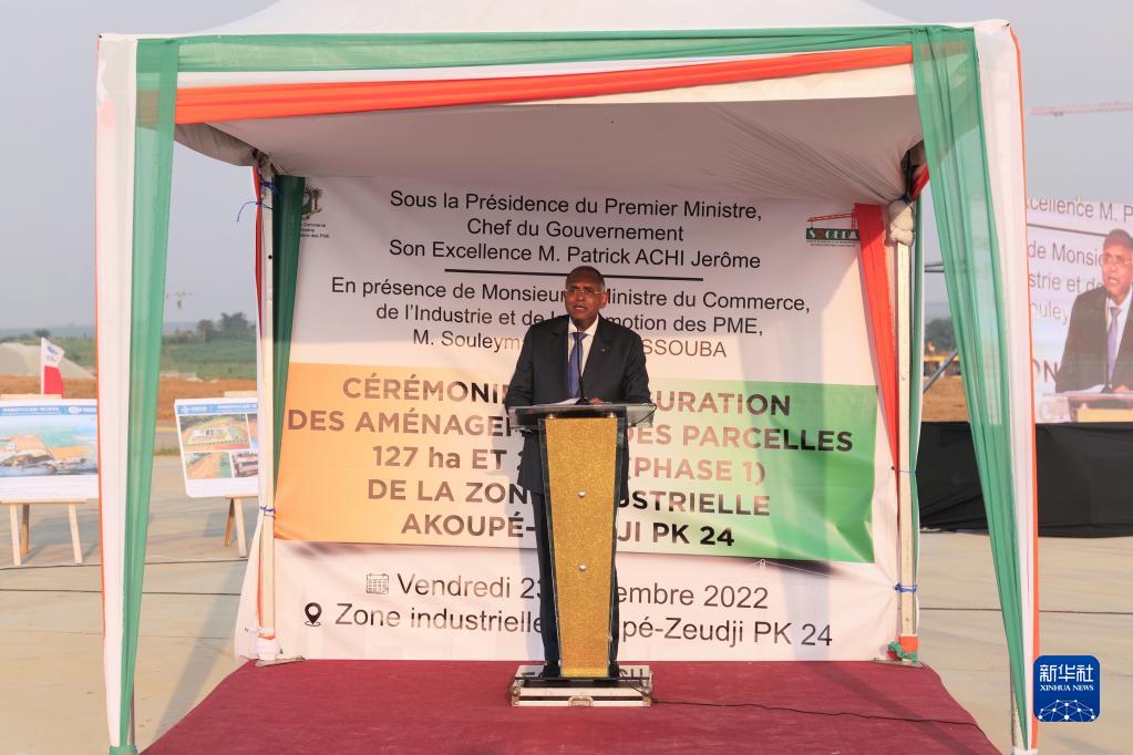 12月23日,在科特迪瓦阿比让市西北部,科特迪瓦总理帕特里克·阿希在PK24工业园一期项目竣工仪式上致辞。