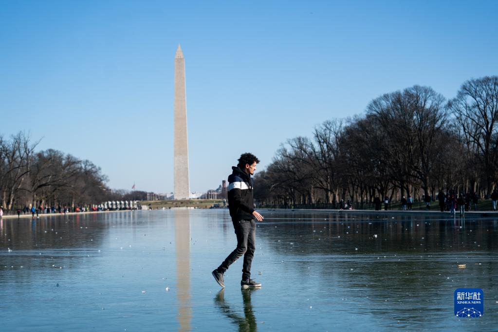 12月25日,在美国首都华盛顿,一名男子在林肯纪念堂倒影池的冰面上行走。