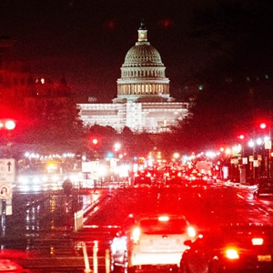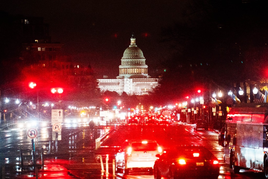 这是12月22日在美国华盛顿拍摄的雨中的车辆和国会大厦。(新华社记者刘杰摄)
