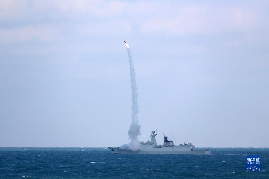 12月26日,在东海某海域举行的中俄“海上联合-2022”联合军事演习联合防空课目演练中,滨州舰实射防空导弹。