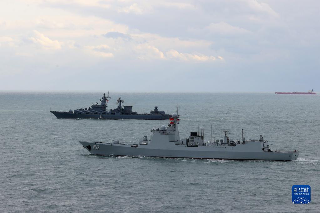 12月27日,在东海某海域举行的“海上联合-2022”联合军事演习结束,中方济南舰(近)和俄方“瓦良格”号导弹巡洋舰(远)编队航行。