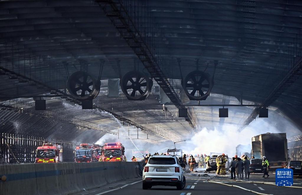 12月29日,消防人员在韩国京畿道果川第二京仁高速公路发生火灾的隔音隧道内工作。