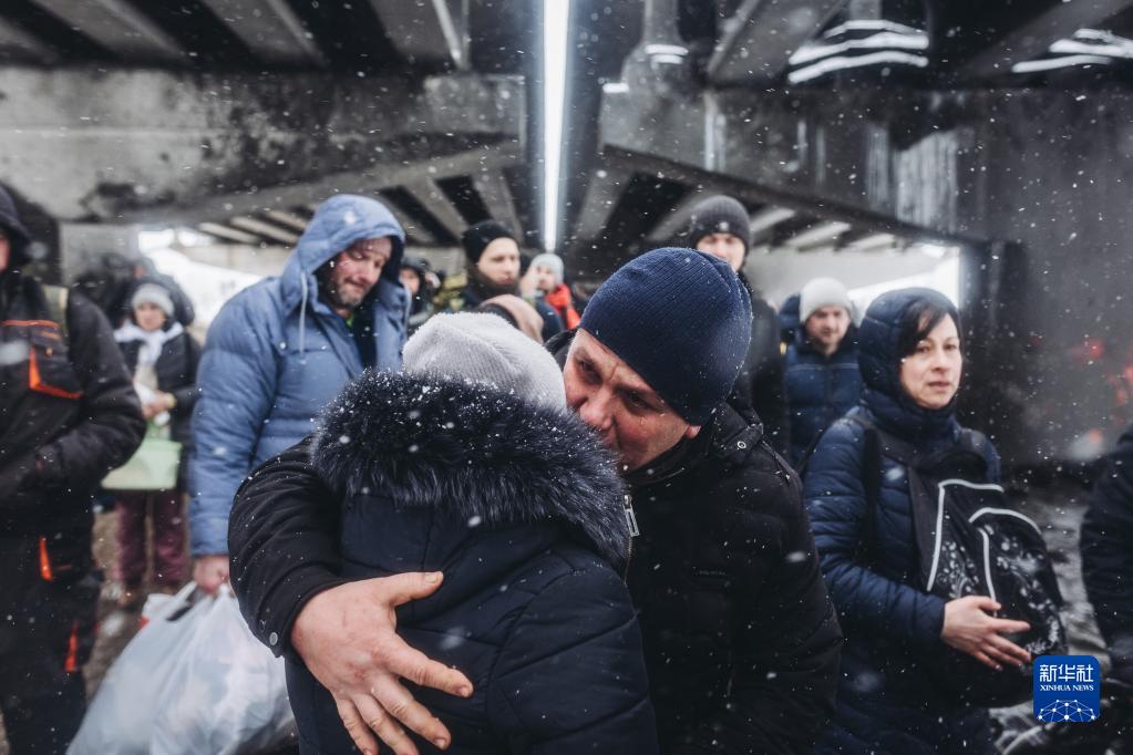 这是2022年3月8日,一对情侣在乌克兰伊尔平告别。俄方3月9日在乌克兰多个城市实行“安静模式”并开放人道主义通道。新华社发(迭戈·埃雷拉摄)