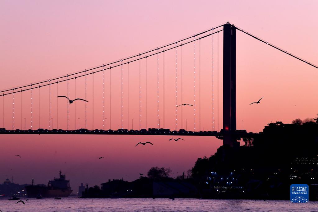 这是12月22日傍晚拍摄的土耳其伊斯坦布尔博斯普鲁斯海峡风光。