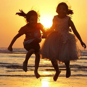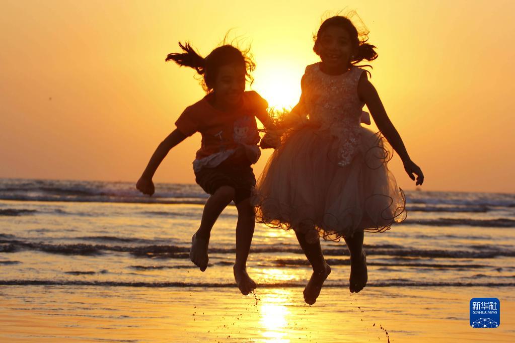 2022年12月31日,孩子们在巴基斯坦卡拉奇海边的夕阳下玩耍。